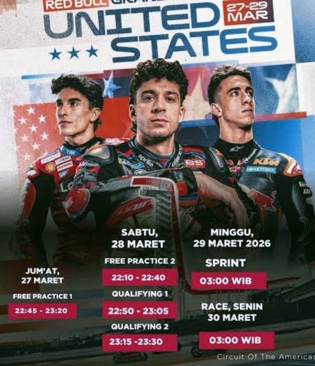 Sprint race akan digelar Minggu (29/3/2026) dini hari WIB. Marc Marquez tercatat sebagai pemenang sprint race musim lalu di COTA dan juga sprint race seri terakhir di Brasil. Pebalap Ducati Lenovo Team itu memburu hasil maksimal sebagai modal menuju balapan utama, sekaligus mengakhiri paceklik kemenangan di COTA yang terakhir diraih lima tahun lalu.